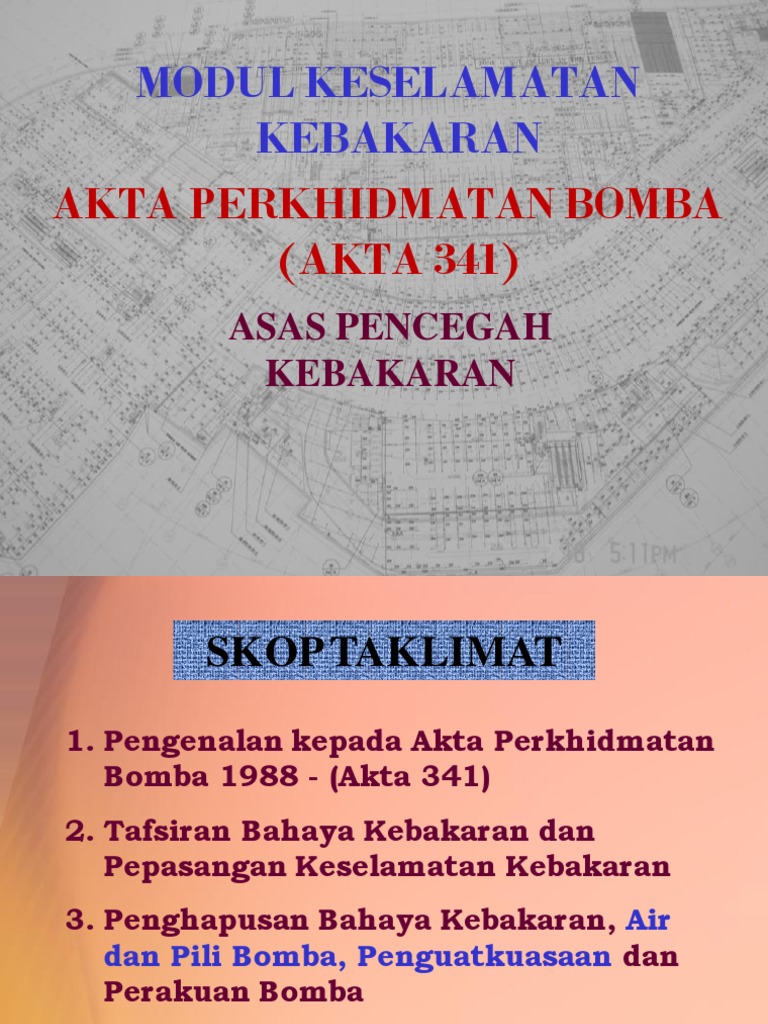 Melaksanakan penguatkuasaan akta perkhidmatan bomba 1988 (akta 341) melalui pelaksanaan mbk; 0 ratings0% found this document useful (0 votes). Akta perkhidmatan bomba 1988 borang d (seksyen 13 (3)) perintah tutup bahawasanya ketua pengarah perkhidmatan bomba+ telah, melalui suatu aduan, memohon kepada mahkamah ini bagi suatu perintah tutup berkenaan dengan. Perkataan bomba dalam bahasa melayu dipinjam daripada perkataan portugis bombeiros. Merupakan akademi bomba yang terbesar di asia tenggara.