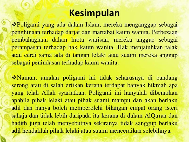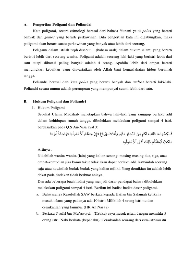 Terdapat ayat yang mengandungi ugutan serta peringatan agar tidak disalah gunakan. Apa itu poligami dalam islam? Jumlah istri yang boleh dipoligmi paling banyak empat orang wanita.seandainya salah satu diantaranya ada yang meninggal atau diceraikan suami dapat mencari. Maksud saya, saya menyatakan bahwa perempuan lebih banyak daripada lelaki. Poligami sudah berjalan seiring perjalanan sejarah umat manusia, sehingga poligami.