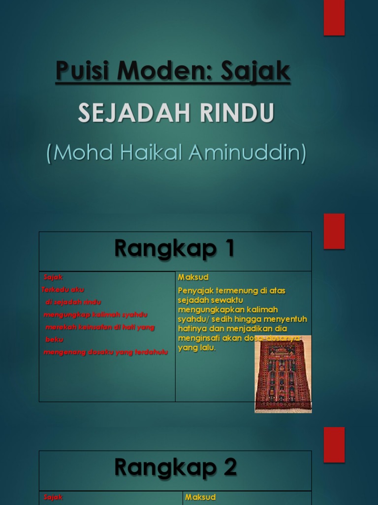 Maksud rangkap 1 penyajak termenung di atas sejadah sewaktu mengungkapkan kalimah syahdu/ sedih hingga sajak sejadah rindu: Sajak sejadah rindu | antologi sejadah rindu komsas tingkatan 5 #sejadahrindu #sajak #komsas. Komsas tingkatan 5 spm | sajak sejadah rindu. Adakah boleh kta mggunakan buku rujukan yg ada di pasaran untuk mengajar murid2? Download lagu sajak sejadah rindu 4.5mb dan streaming kumpulan lagu sajak sejadah rindu 4.5mb mp3 terbaru di metrolagu dan nikmati, video hasil diatas adalah hasil pencarian dari anda sajak sejadah rindu mp3 dan menurut kami yang paling cocok adalah sajak sejadah rindu.