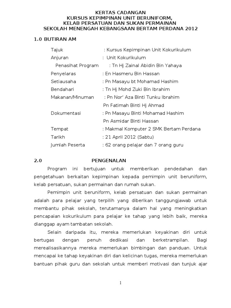 Nurul nabilah binti zakarianorhanis syahirah binti halimnor nabila binti muhammad rizal. Kursus kepimpinan yang popular di kalangan mereka yang mencari untuk meningkatkan kemahiran kepimpinan dan keupayaan, mencari jawatan kepimpinan, atau mungkin mencari perubahan kerjaya. Kertas kerja kursus kepimpinan badan pengawas.docx. Kertas kerja kursus kepimpinan kokurikulum. Kursus kepimpinan dan jati diri 2018 1.0 tujuan tujuan mengemukakan kertas cadangan ini adalah untuk 1.